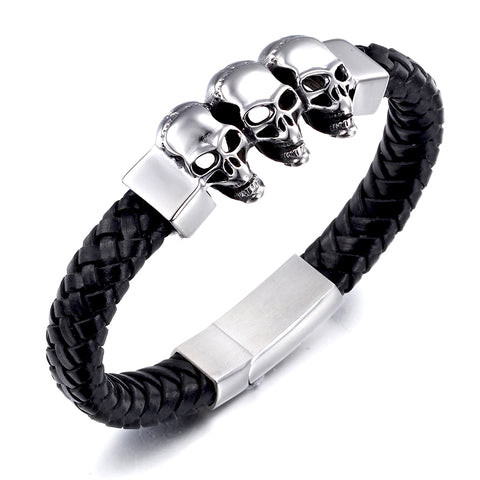 Finely handcrafted leather band that fits your wrist comfortably and securely. A unique statement piece featuring three detailed skulls. Made from stainless steel and genuine leather to withstand the rigours of everyday use. Weighs 46 g giving it a feel of quality. Length: 21.5 cm We ship with a USPS tracking number. Shipping takes between two and four weeks. Limited quantity...