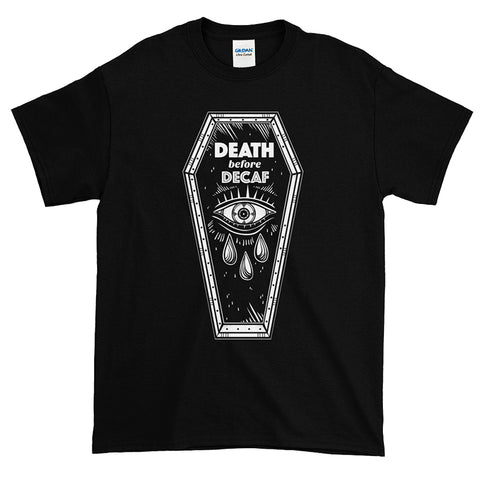 Featuring an original Death Before Decaf design exclusive to Multiverse Gifts on a high quality Gildan® men's cotton t-shirt. Perfect for the truly hardcore caffeine lovers out there! 100% jersey knit 6oz. fabric weight Pre-shrunk Seamless, double-need ⅞” collar Taped neck and shoulders Classic fit Your typical 100% cotton t-shirt (except for heather colors, which contain 10% polyester). Pre-shrunk to make sure your...