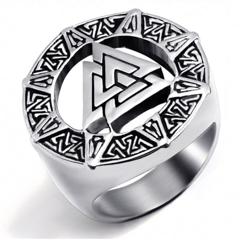 The Valknut Warrior's Ring is also known as the warrior's knot. The central triangles are called "The Valknut, The Knot of the Fallen", a Sacred Symbol to Odin, King of the Nordic Gods. This Magical Knot was self carved into the breasts of wounded Viking Warriors so their Souls would be carried by the Valkyries to Valhalla, the Heavenly Meeting...
