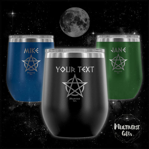 Personalize this Pentacle Wine Tumbler with your choice of text! Your custom text will be laser etched onto the textured sweat-free powder coating, exposing the high quality stainless steel underneath. Our premium laser etching ensures that your unique design will last forever. The 12 oz Pentacle Wine Tumbler makes a perfect addition to any drinkware collection as well as an all occasion gift for...