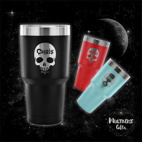 Personalize this Skull Tumbler with your choice of text! Your custom text will be laser etched onto the textured sweat-free finish. Your choice of seven colors. Our premium laser etching ensures that your design will last forever. The 30 oz Skull Tumbler makes a perfect addition to any drinkware collection as well as an all occasion gift for family, friends or loved...
