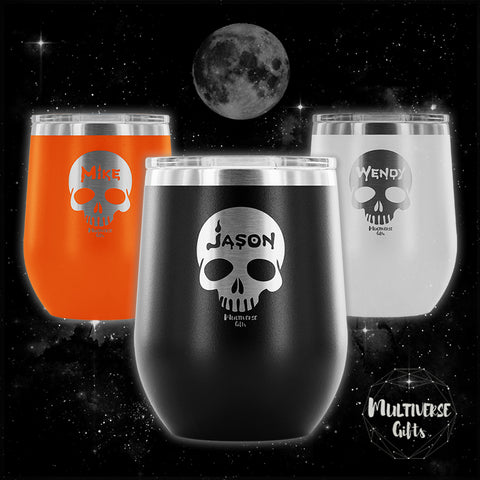 Personalize this Skull Wine Tumbler with your choice of text! Your custom text will be laser etched onto the textured sweat-free powder coating, exposing the high quality stainless steel underneath. Our premium laser etching ensures that your unique design will last forever. The 12 oz Skull Wine Tumbler makes a perfect addition to any drinkware collection as well as an all occasion gift for family, friends or...