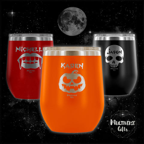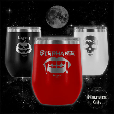 Personalize this Vampire Wine Tumbler with your choice of text! Your custom text will be laser etched onto the textured sweat-free powder coating, exposing the high quality stainless steel underneath. Our premium laser etching ensures that your unique design will last forever. The 12 oz Vampire Wine Tumbler makes a perfect addition to any drinkware collection as well as an all occasion gift for family, friends or...