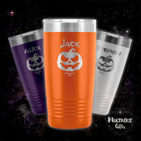 Personalize this Pumpkin Tumbler with your choice of text! Your custom text will be laser etched onto the textured sweat-free powder coating, exposing the high quality stainless steel underneath. Our premium laser etching ensures that your design will last forever. Perfect as a Halloween Pumpkin Tumbler gift. This 20 oz Pumpkin Tumbler makes a perfect addition to any drinkware collection as well as an all occasion...