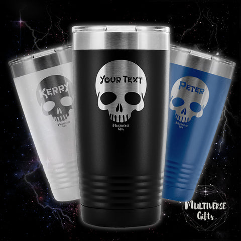 Personalize this Skull Tumbler with your choice of text! Your custom text will be laser etched onto the textured sweat-free powder coating, exposing the high quality stainless steel underneath. Our premium laser etching ensures that your design will last forever. This 20 oz Skull Tumbler makes a perfect addition to any drinkware collection as well as an all occasion gift for family, friends or loved ones. ...